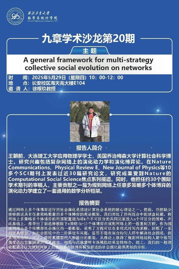 5月29日,美国乔治梅森大学(George Mason University)计算社会科学博士王朝前到访少妇偷情 ,为我院师生带来题为《A general framework for multi-strategy collective social evolution on networks》的学术报告。学院20余位师生参会,会议由副院长徐根玖教授主持。
